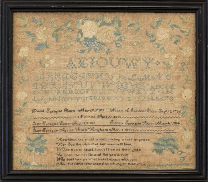 Published April 11, 2024 at 850 × 744 in Nature vs. Nurture: Consider the Spragues, Part 2 Sampler Jane Sprague Genealogical Sampler, 1820 (Hingham Historical Society) ← Previous Next →
