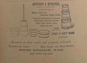 - Anthony J. Sprague (1855-1921), who ran the ad shown here for his woodenware business in the 1894 Hingham-Hull Directory. One of Anthony J. Sprague’s buckets is this firkin from the Historical Society’s collection.