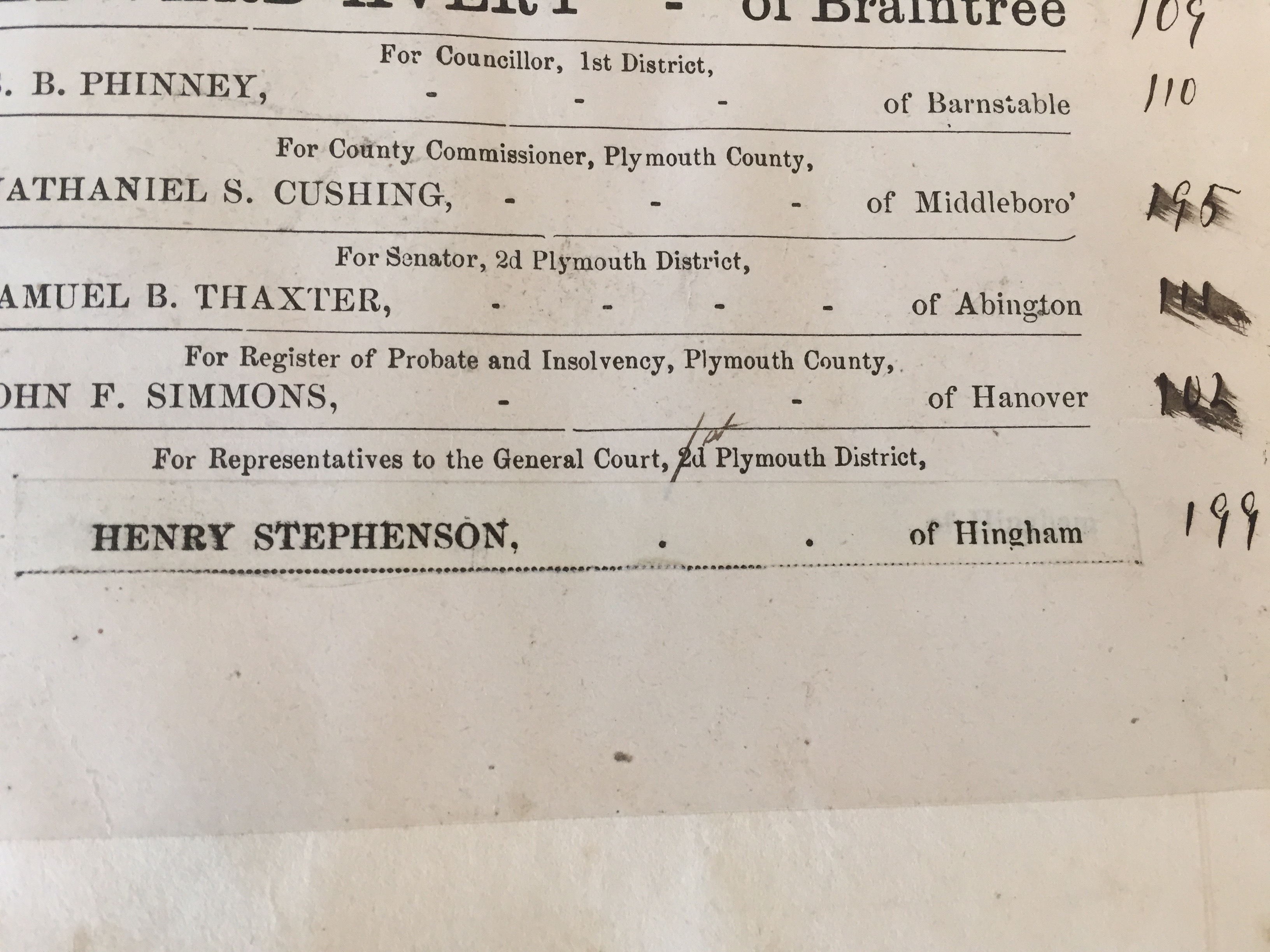 In the 1840s, Hosea published several issues of a periodical of his observations about life, history, and weather: “Hosea Sprague’s Chronicle.” In an October 18, 1888, feature story, published in the Hingham Journal, Hingham’s Luther Stephenson (a Civil War general, who had both maternal and paternal Sprague grandmothers) wrote about his cousin Hosea: “He had great respect for the first settlers of Hingham, and spent much time in deciphering and copying in his bold hand the early records of the town…”