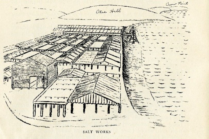 The Sears family was instrumental in the development of New England’s salt industry. Pre-revolutionary colonists imported salt from England. The war-time embargo created a crisis on Cape Cod, where salted fish was a staple food and primary export. Captain John Sears of Dennis is credited with having invented the method of sea salt extraction by solar extraction described above. Well suited to New England’s climate, it was adopted across the Cape as our domestic salt industry grew, aided by tariffs imposed by the young United States government. It was also the system used in Hingham. Orin Sears moved to Hingham from Dennis in 1846, motivated by “the desire to keep his boys from going to sea,” then “the only lucrative business on the Cape.” He purchased the salt works described in the Historical Society paper, although the heyday of the local salt industry had already passed. Between the mid-1830s and the mid-1850s, as the result of the decline of its fisheries and the development of alternate domestic sources of salt, Hingham’s salt production declined from over 20,000 bushels a year to fewer than 2,000.