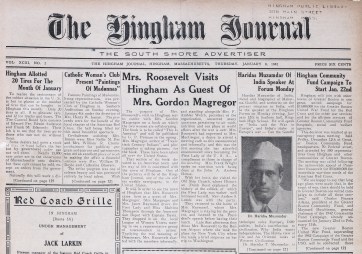 American, regardless of ethnicity, and Eleanor was thrilled to discover that the Hingham High School football squad that year had players whose families had come from eight different parts of the world and that Hingham was home to Dutch and Polish farmers, Italian shoe makers, and a German harness maker, amongst many others. In 1942 Hingham had a population of 8,000. It still had 50 farms—but it also had a commuter train., and much of its population now travelled to work in Boston. There were, of course, schools, churches of all kinds, and a public library with 28,000 volumes. The Loring Hall movie theater would be showing Citizen Kane the following week.
