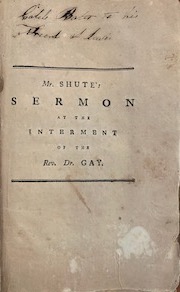 During the Revolutionary War, Reverend Shute was an ardent patriot, but remained a steadfast friend of Reverend Ebenezer Gay (1696-1787) of Old Ship, who was a loyalist. The two pastors exchanged pulpits, with the Shute traveling up Main Street to preach at Old Ship while Gay went down to South Hingham to do the same. When Ebenezer Gay died in 1787 at the age of 90, Daniel Shute preached at his burial. His son, Dr. Daniel Shute (1756-1829), was a surgeon in the Continental Army and served under Alexander Hamilton and Maj. Gen. Benjamin Lincoln.