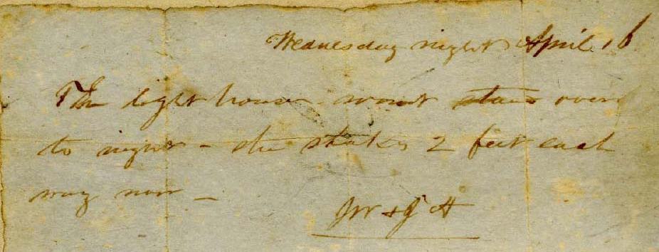 The lighthouse won’t stand over to night. She shakes 2 feet each way now. — J.W. + J.A