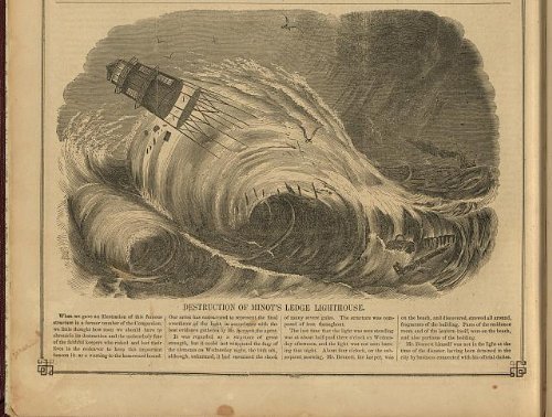 Between 1832 and 1841, forty vessels foundered on the rocks at Minot’s Ledge off Cohasset and Scituate, and in the late 1840s, a lighthouse was built on the ledge.  It was lit for the first time on January 1, 1850.