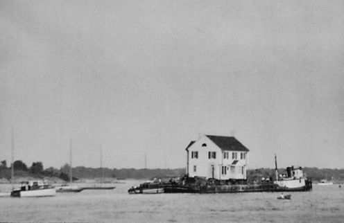 Back in 1946 there was a bit of a housing shortage. Hingham dentist Ross Vroom bought a two-story Garrison colonial house on Gallops Island and had it placed on a barge and floated over to World’s End. He had a cellar dug at 22 Seal Cove Road, and the house still sits there today.