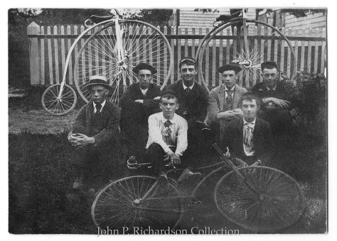 These seven Hingham boys posed with three bicycles are witnessing the birth of modern cycling. Behind them are two older bicycles—so-called “high wheelers” or “penny farthings” (the latter nickname descriptive of the relative sizes of the two wheels). High-wheelers originated in England and became popular in the United States in the early 1880s. As this photo lets us see clearly, these early bicycles had a “direct drive” mechanism, that is, the pedals attach directly to the wheel, so that the cyclist’s motion turns the wheel directly. Enlarging the front wheel, therefore, was the only way to make the bicycles go faster–and this is what happened. Front wheels often five feet in diameter, with the cyclist perched directly over the wheel, meant an increased risk of the cyclist pitching headfirst from the front of his bike. Cycling in the era of the high wheelers was a sport for athletic young men.